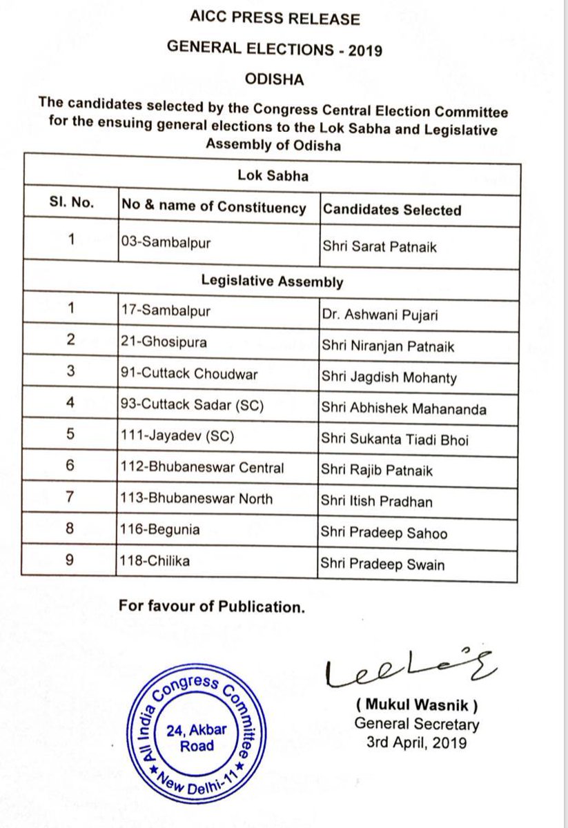 कांग्रेस की नई लिस्ट जारी की गई है। इस लिस्ट में कुल 10 नाम हैं। इन 10 नामों से एक नाम ओडिशा से लोकसभा चुनाव के लिए है जबकि 9 नाम विधानसभा चुनावों के लिए हैं।