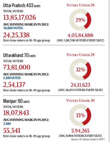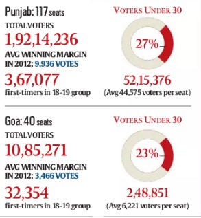 अंदाजे के मुताबिक, पंजाब की 117 सीटों में से हर सीट पर 44,000 युवा वोटर हैं। वहीं गोवा की 40 विधानसभा सीटों में से प्रति सीट पर 6,200 युवा हैं। यह आंकड़ें उम्मीदवारों को परेशानी में डालने वाले इसलिए हैं क्योंकि 2012 के विधानसभा चुनाव में पंजाब और गोवा का जीत का अंतर 9,936 और 3,466 के एवरेज पर था। यानी युवाओं से इस बार के चुनाव में वोट डालने से काफी फर्क पड़ेगा।