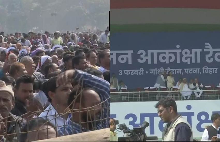 जन आकांक्षा रैलीः पटना के गांधी मैदान में कार्यक्रम के लिए भारी भीड़ जुटी है। थोड़ी देर में यहीं पर कांग्रेस अध्यक्ष राहुल गांधी पार्टी कार्यकर्तांओं और जनता को संबोधित करेंगे। (फोटोः ANI)