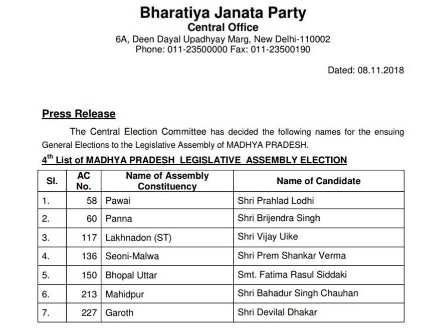 मध्य प्रदेश विधानसभा चुनाव के मद्देनजर बीजेपी ने चौथी लिस्ट जारी कर दी है। इसमें सात उम्मीदवारों के नामों की घोषणा की गई है। पवई, पन्ना, लखनादौन, सियोनी-मालवा, भोपाल उत्तर, महिदपुर और गरोथ सीटों से उम्मीदवारों का ऐलान बीजेपी ने कर दिया है।