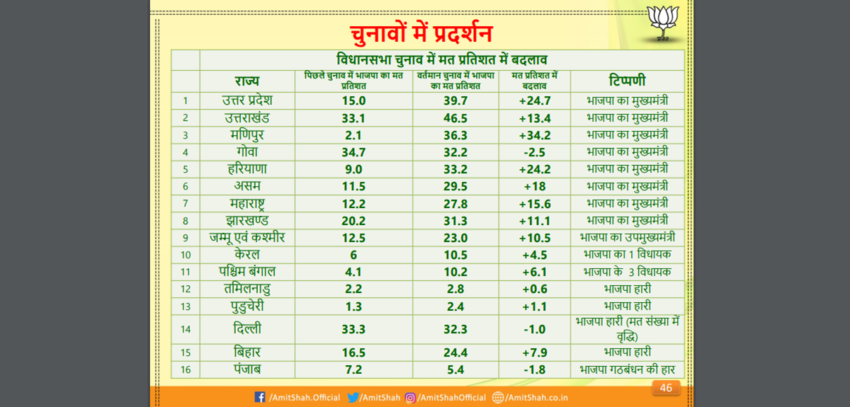 2017 में बचाया किला: 2017 में सात राज्यों में विधान सभा चुनाव हुए। इनमें सबसे अहम गुजरात था जहां प्रधानमंत्री नरेंद्र मोदी और भाजपा अध्यक्ष शाह की इज्जत दांव पर लगी हुई थी। वहां भाजपा ने जीत हासिल करते हुए लगातार पांचवीं बार सरकार बनाई मगर कांग्रेस ने उसकी जीत का आंकड़ा कम कर दिया और भाजपा को 99 पर रोक दिया। हालांकि, इसी साल भाजपा ने उत्तर प्रदेश, उत्तराखंड और हिमाचल में प्रचंड बहुमत से सरकार बनाई। गोवा और मणिपुर में अमित शाह ने अपने कौशल से गठबंधन सरकार बनवाई। पंजाब में भाजपा और अकाली दल गठबंधन को हराकर कांग्रेस ने सत्ता हथियाई।