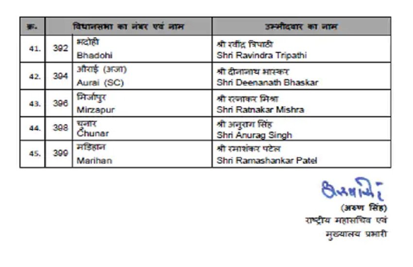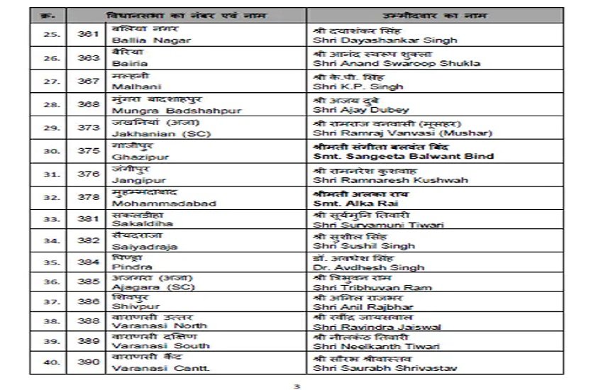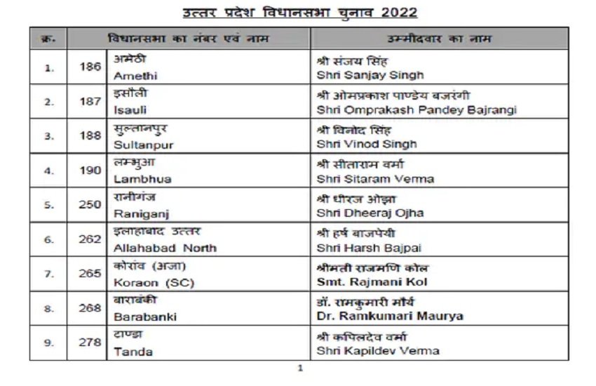 इसके अलावा कृष्णानंद राय की पत्नी अलका राय को मोहम्दाबाद से टिकट दिया गया है। वहीं नई सूची में शिवपुर से अनिल राजभर, यूपी के चर्चित जिले अमेठी में रानी गरिमा सिंह की जगह उनके पति संजय सिंह, इलाहाबाद उत्तर से हर्ष बाजपेई, कोरांव से आरती कोल की जगह राजमणि कोल को टिकट दिया गया है।