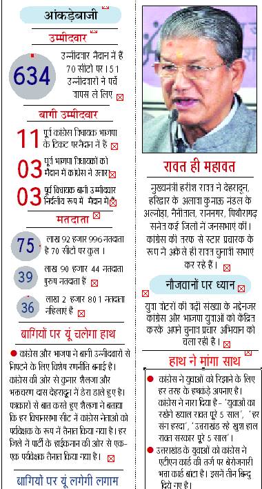 उत्तराखंड में चौथे विधानसभा चुनाव को लेकर सूबे के दो प्रमुख राजनीतिक दलों कांग्रेस और भाजपा ने राजनीति की शतरंज में अपनी-अपनी गोटियां बिछा दी हैं। नाम वापसी के बाद सूबे की सभी 70 विधानसभा सीटों पर उम्मीदवारों की तस्वीर साफ हो गई है। अधिकतर सीटों पर भाजपा और कांग्रेस के बीच ही सीधा मुकाबला है जबकि हरिद्वार और उधमसिंहनगर जिलों में कांग्रेस और भाजपा के साथ-साथ बसपा भी मुकाबले में दिखाई दे रही है। इससे इन दोनों जिलों में तिकोना मुकाबला हो रहा है। बगावत से सभी दल जूझ रहे हैं।