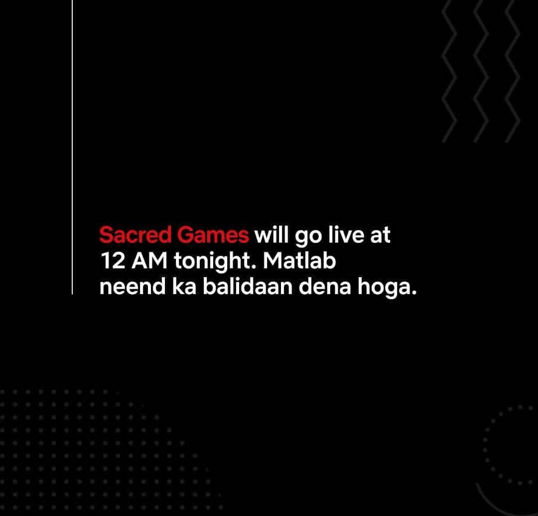 सेक्रेड गेम्स रात को 12 बजे प्रसारित होगा। ऐसे में सोशल मीडिया पर लोगों कह रहे हैं कि नींद का बलिदान देना होगा।