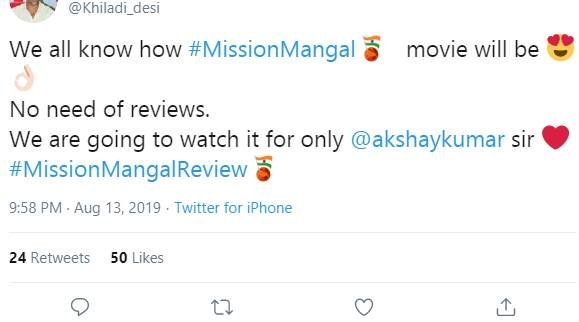 मीडिया रिपोर्ट्स के मुताबिक, मिशन मंगल को बॉक्स ऑफिस पर जबरदस्त रिस्पॉन्स मिल रहा है। फिल्म की कुछ शहरों में अच्छी एडवांस बुकिंग हुई है। माना जा रहा है कि फिल्म बॉक्स ऑफिस पर पहले दिन अच्छी कमाई कर सकती है।