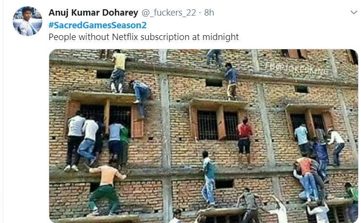 Netflix की वेबसीरीज सेक्रेड गेम्स 2 आधी रात को रिलीज कर दी गई है। वेबसीरीज को सोशल मीडिया पर जबरदस्त रिस्पॉन्स मिल रहा है। लोग सेक्रेड गेम्स को देखने के लिए उतावले हैं। देखिए सोशल मीडिया पर कैसे वेबसीरीज को देखने के लिए आतुर लोगों का बना रहे मजाक
