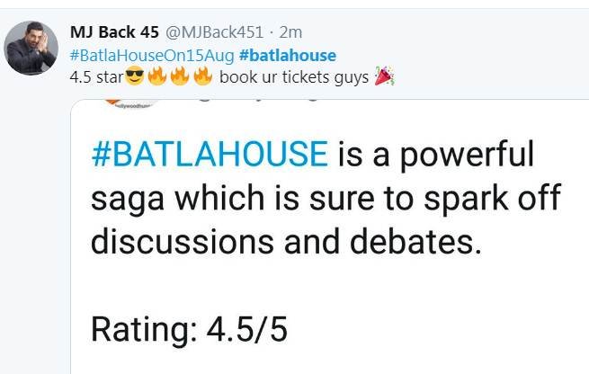जहां एक ओर अक्षय कुमार की फिल्म को एडवांस बुकिंग में शानदार रिस्पॉन्स मिल रहा है। वहीं दूसरी ओर जॉन अब्राहम की फिल्म बटला हाउस के क्रिटिक्स का अच्छा रिस्पॉन्स मिला है। फिल्म को पांच में से 4.5 स्टार्स मिले हैं।