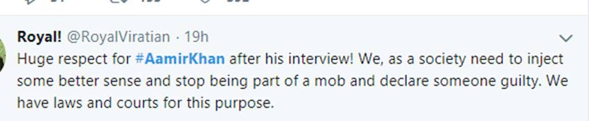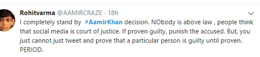आमिर के फैसले के बाद से ही सुपरस्टार सोशल मीडिया पर चर्चा का विषय बन गए हैं। आमिर खान के फैंस उनके इस फैसले से खुश हैं और उन्हें सपोर्ट करते भी दिखाई दे रहे हैं। एक यूजर ने कहा- टमैं आमिर से बिलकुल सहमत हूं और उनके साथ हूं। कोई भी कानून से बढ़कर नहीं है। लोग समझते हैं कि सोशल मीडिया में ऐसे इंसाफ मिलेगा। लेकिन एक ट्वीट से किसी की सच्चाई पता नहीं चलती’। देखें और क्या कह रहे लोग:-