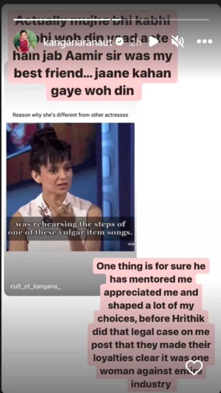 वहीं इस वीडियो को शेयर करते हुए कंगना रनौत ने लिखा कि ‘मुझे भी कभी-कभी वो दिन याद आते हैं जब आमिर सर मेरे दोस्त हुआ करते थे। जाने कहां गए वो दिन। इसी के साथ कंगना ने आगे लिखा कि एक बात तो पक्की है कि आमिर सर ने मुझे मेंटोर किया है। उन्होंने मेरे काम की तारीफ की है और ऋतिक के केस से पहले उन्होंने मेरी पसंद को काफी शेप किया है, लेकिन इसके बाद उन्होंने अपनी लॉयलिटी क्लियर कर दी और एक महिला के खिलाफ पूरी फिल्म इंडस्ट्री खड़ हो गई।’