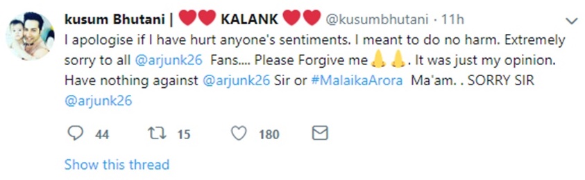 इस बीच वरुण धवन ने भी मामले को संभालते हुए ट्वीट किया, ‘मैं खुश हूं कि कुसुम तुमने माफी मांग ली है। अर्जुन परेशान नहीं है। तुम बस अपने जीवन जीने की कोशिश करो। मैं हमेशा कहता हूं अर्जुन कपूर के पास बड़ा दिल है। मैं अपने किसी भी फैंस से नहीं चाहूंगा कि वह किसी भी एक्टर के बारे में ऐसी बातें करें’