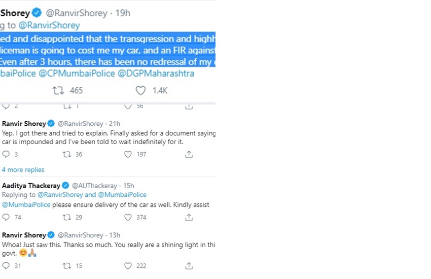 हालांकि बाद में रणवीर के इस ट्वीट पर महाराष्ट्र के कैबिनेट मंत्री आदित्य ठाकरे ने भी रिप्लाई किया। उन्होंने अपने ट्वीट में कहा- ‘मुंबई पुलिस जल्दी ये सब ठीक करें, औऱ गाड़ी भी वापस करें।’ रणवीर ने जब आदित्य ठाकरे का ये ट्वीट देखा तो उन्होंने आदित्य को शुक्रिया कहते हुए कहा- इस सरकार में आप एक प्रकाश की तरह हैं। धन्यवाद।