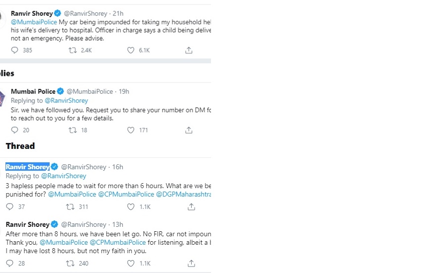 रणवीर ने अपने ट्वीट में ये भी बताया था कि उनकी गाड़ी उनका सहयोगी अपनी प्रेग्नेंट वाइफ को अस्पताल दिखाने के लिए लेकर गया था, लेकिन रास्ते में ही पुलिस ने रोक लिया। रणवीर ने अपने ट्वीट में यह भी दावा किया कि एक पुलिसवाले ने ये भी कहा कि डिलीवरी इमरजेंसी केस नहीं है। रणवीर ने इस पर सुझाव भी मांगा कि ‘ऐसी हालत में अब मैं क्या करूं?’