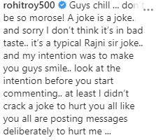 वहीं अपने पोस्ट पर चौतरफा विरोध होता देख रोहित ने माफी मांगते हुए लिखा , दोस्तों शांत हो जाइए। इतने सख्त मत बनिए। यह सिर्फ एक चुटकुला था और मुझे नहीं लगता कि मैंने ये बुरी मंशा से शेयर किया है। यह टिपिकल रजनी सर वाला जोक था और मेरा इरादा आप लोगों को हंसाने का था। कुछ कहने से पहले सामने वाले की मंशा को समझिए। कम से कम मैंने आप लोगों को चोट पहुंचाने के लिए मजाक नहीं किया, जैसे कि आप लोग जानबूझकर मुझे चोट पहुंचाने के लिए मैसेजेस लिख रहे हैं।’