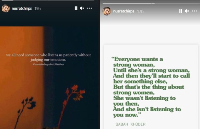 नुसरत ने एक और स्टोरी शेयर की जो कि काफी इमोशन है। पोस्ट में लिखा है- ‘हम सब को एक ऐसे शख्स की जरूरत होती है जो हमें धैर्य के साथ सुने और समझे। वह भी हमारे इमोशन्स को जज किए बिना।’