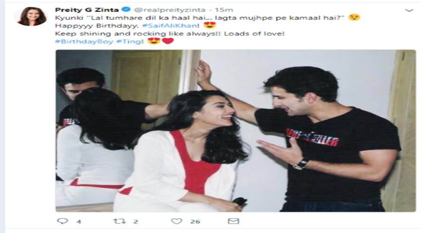 अभिनेत्री प्रीति जिंटा ने भी सैफ अली खान को उनके जन्मदिन की शुभकानाएं दी। लेकिन प्रीति जिंटा ने सैफ अली खान को शुभकानाएं देते हुए ट्विटर पर कुछ ऐसा लिख दिया जिसे उन्हें तुरंत हटाना पड़ा। प्रीति जिंटा ने अपनी और सैफ अली खान की एक तस्वीर शेयर करते हुए लिखा ‘क्योंकि लाल तुम्हारे दिल का हाल है…लगता मुझपे कमाल है..हैप्पी बर्थडे..हमेशा मुस्कुराते रहिए और आगे बढ़ते रहिए…ढेर सारा प्यार।’ हालांकि जल्दी ही प्रीति जिंटा ने अपने इस ट्वीट को हटा भी लिया।