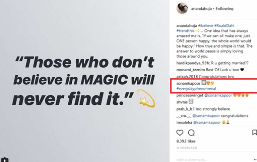 आनंद के द्वारा शेयर की गई तस्वीर में तस्वीर में लिखा है, ”जिन लोगों को जादू पर विश्वास नहीं है वह कभी समझ नहीं सकते।” आनंद की इस पोस्ट पर कमेंट करते हुए लिखा, ”हर दिन जादू भरा है।” इसके साथ ही सोनम ने लव और किस इमोजी का भी इस्तेमाल किया है। आनंद और सोनम के डेटिंग की खबरें उस वक्त सामने आ लगी थी जब दोनों अक्षय कुमार स्टारर फिल्म ‘रुस्तम’ की सक्सेज पार्टी में एक साथ देखा गया था। हालांकि सोनम ने आनंद के साथ रिलेशनशिप की खबरों पर कभी चुप्पी नहीं तोड़ी। लेकिन दोनों अक्सर एक साथ मीडिया के कैमरे में स्पॉट होते रहे हैं।