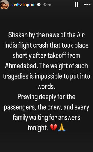 जान्हवी कपूर ने इंस्टाग्राम स्टोरी शेयर करते हुए लिखा, “अहमदाबाद से उड़ान भरने के कुछ ही देर बाद एयर इंडिया की फ्लाइट के दुर्घटनाग्रस्त होने की खबर सुनकर मैं स्तब्ध हूं। ऐसी त्रासदियों का दर्द शब्दों में बयां करना असंभव है। मैं यात्रियों, क्रू और आज रात जवाब का इंतजार कर रहे प्रत्येक परिवार के लिए गहराई से प्रार्थना कर रही हूं।”
