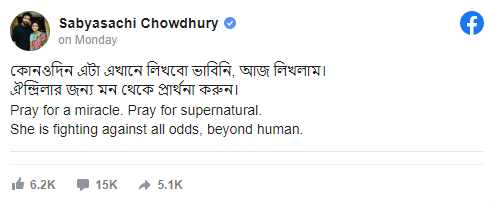 साब्यसाची चौधरी ने लिखा, ‘मैंने कभी नहीं सोचा था कि मुझे यह सब लिखना पड़ेगा, लेकिन अब वह दिन आ गया है। आप सब एंड्रिला के लिए दुआएं करें, चमत्कार के लिए प्रार्थना करें…वह अपनी पूरी ताकत से लड़ रही है, लेकिन…’।