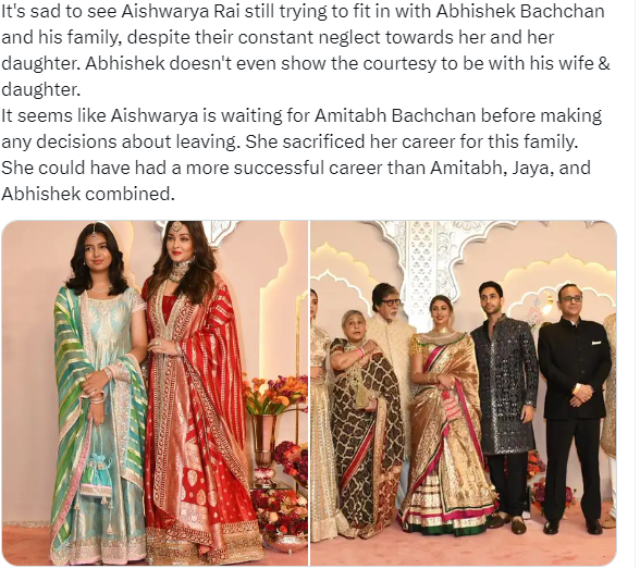 बता दें कि अनंत-राधिका की शादी में ऐश्वर्या राय अपनी बेटी के साथ पहुंची थी और अभिषेक अपने परिवार के साथ नजर आए थे। इसपर भी यूजर्स का कहना है कि अभिषेक को अपनी पत्नी की बिल्कुल परवाह नहीं है। शुभ आशीर्वाद सेरेमनी में भी ऐश्वर्या अपनी बेटी के साथ अलग पहुंची थीं।