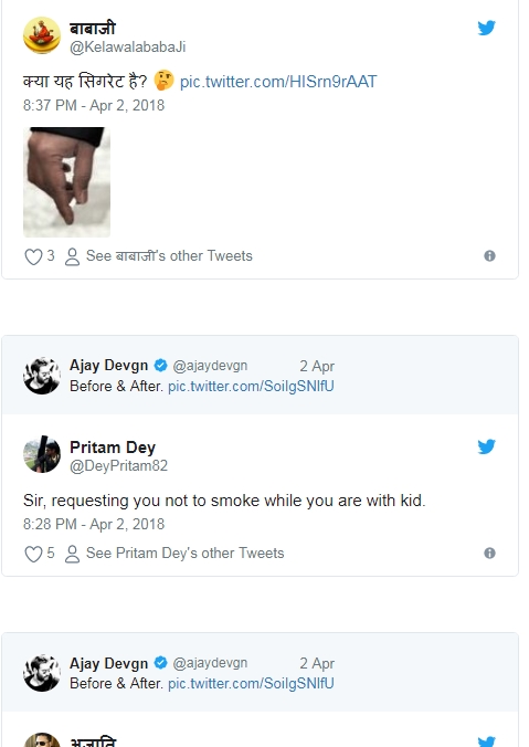 मीडिया रिपोर्ट्स के अनुसार, साल 2008 में जब काजोल के पिता को हार्ट अटैक आया तो वह अजय की स्मोकिंग की आदत से काफी परेशान हो गई थीं। हालांकि, उन्होंने बीते साल अजय को स्मोकिंग छोड़ने के लिए भी राजी कर लिया था। लेकिन यह फोटो बताती है कि अजय ने स्मोकिंग नहीं छोड़ी है। अजय इन दिनों अपनी फिल्म ‘रेड’ को लेकर चर्चा में हैं। फिल्म बॉक्स ऑफिस पर धमाकेदार कमाई कर रही है। माना जा रहा है कि अजय की फिल्म जल्द ही 100 करोड़ के क्लब में शामिल हो जाएगी। फिल्म ‘रेड’ साल 1980 की एक सच्ची घटना पर आधारित है।