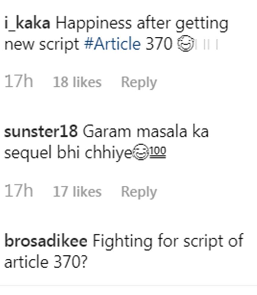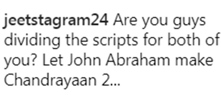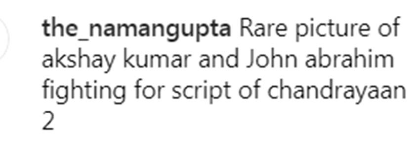 एक यूजर ने लिखा- खूब स्क्रिप्ट मिल रही है, मोदी जी का शुक्रिया करो। वहीं एक सोशल मीडिया यूजर ने लिखा- अक्षय-जॉन की चंद्रयान-2 की स्क्रिप्ट के लिए लड़ने वाली रेयर तस्वीर। वहीं एक यूजर ने लिखा- कोई स्क्रिप्ट मिल गई क्या। एक इंस्टाग्राम लिखता है- मस्का लगा रहे हैं चंद्रयान-2 की स्क्रिप्ट के लिए। वहीं कई सोशल मीडिया यूजर्स ने ‘देसी ब्यॉज’ फिल्म के सीक्वल को लाने की बात कही है।