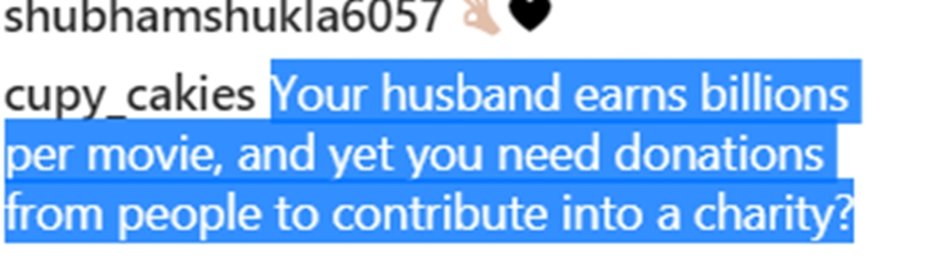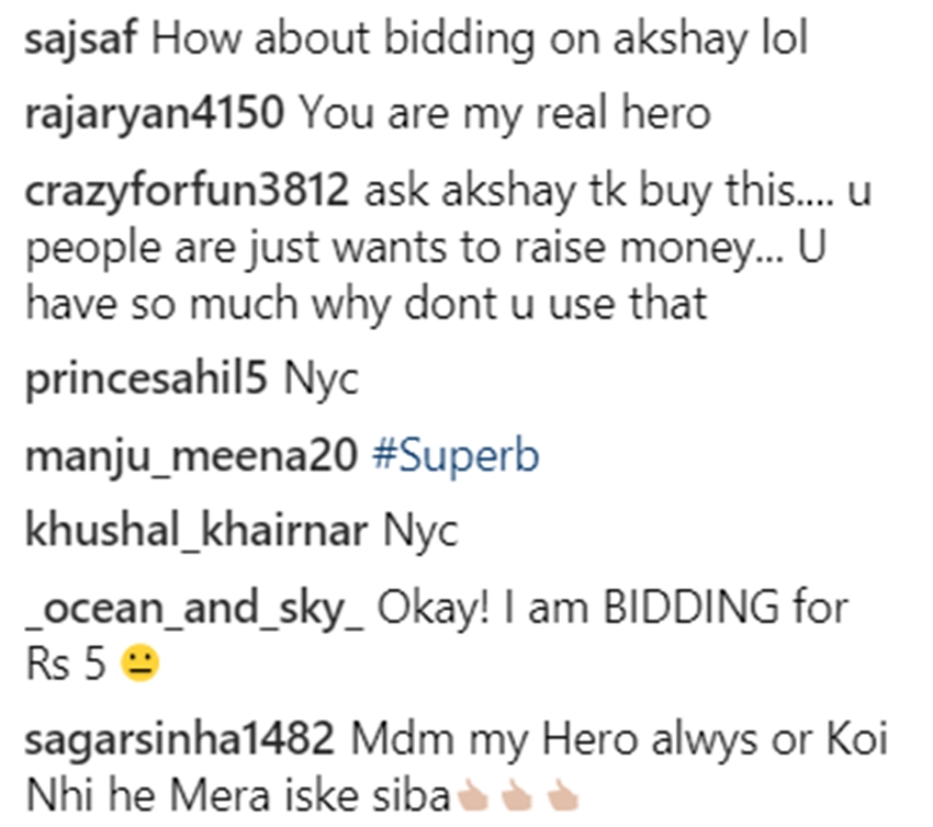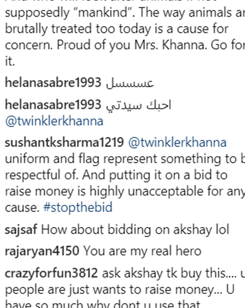 एक यूजर ने लिखा- अक्षय को कहिए कि वही खरीद लें, आप लोग सिर्फ पैसे ‘रेज’ करना चाह रहे हैं। आपके पास भी तो बहुत सारा धन है उसका इस्तेमाल क्यों नहीं करते। दूसरे यूजर ने लिखा- यूनिफॉर्म और फ्लैग ये रिस्पेक्ट के काबिल हैं। और आप इसे चंद पैसों के लिए बेच रहे हैं और पैसा बटोर रहे हैं ये गलत है। एक यूजर ने लिखा- तुम्हारा पति एक फिल्म का बिलियन कमाता है। और आपको डोनेशन के लिए कॉन्ट्रिब्यीशन चाहिए, चैरेटी के लिए?