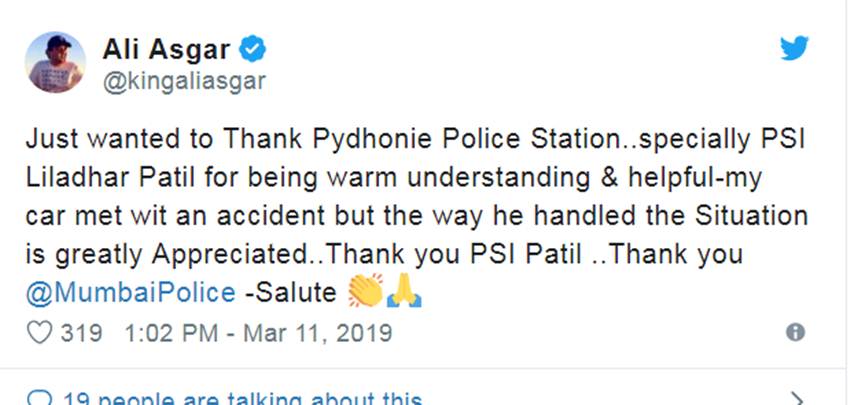 टीओआई को एक इंटरव्यू मे अली ने कहा, ”भगवान का शुक्रगुजार हूं कि कुछ हुआ नहीं। मैं बाद में यह सोच रहा था कि यदि कार रफ्तार में होती या फिर लोग भी आसपास होते क्या होता? इतनी जल्दबाजी किस बात की है। मैं इस हादसे के बाद बेहद डर गया था।” अली असगर ने पुलिस का धन्यवाद करते हुए कहा, ”अच्छी बात यह है कि पुलिस भी आसपास थी। भीड़ जमा हो गई थी, जिसके बाद पुलिस ने मदद की। उन्होंने अच्छी तरह से इस मामले को संभाला।”