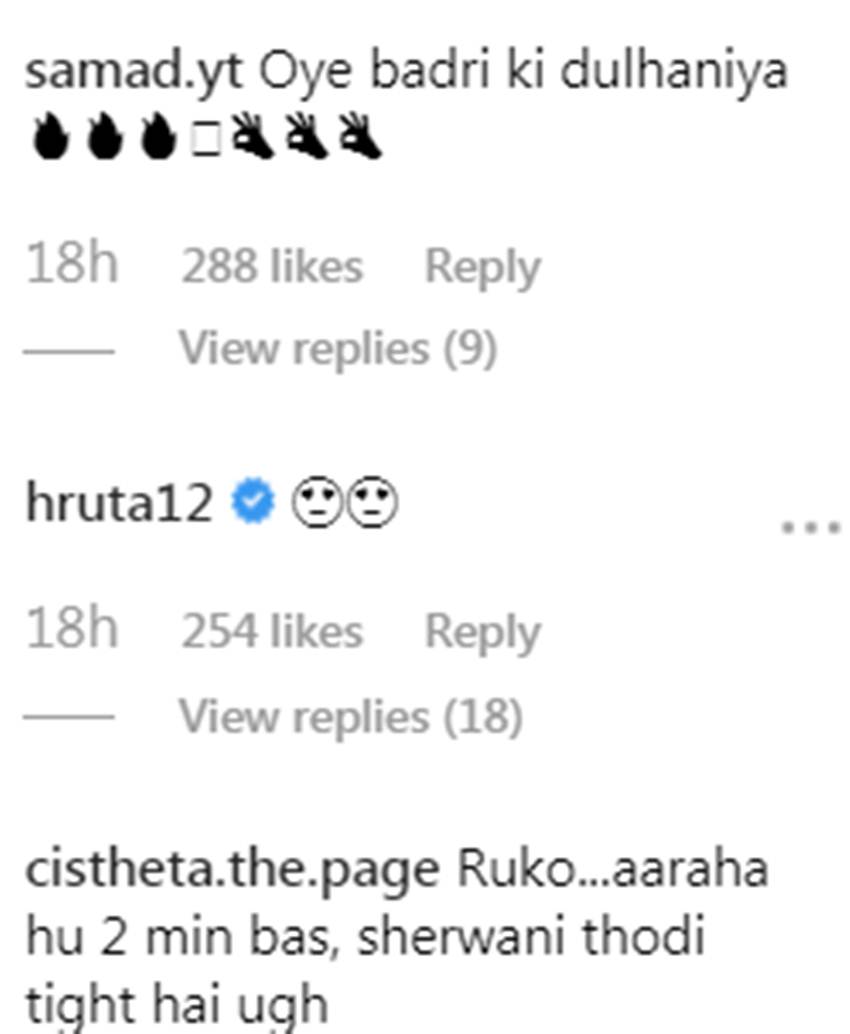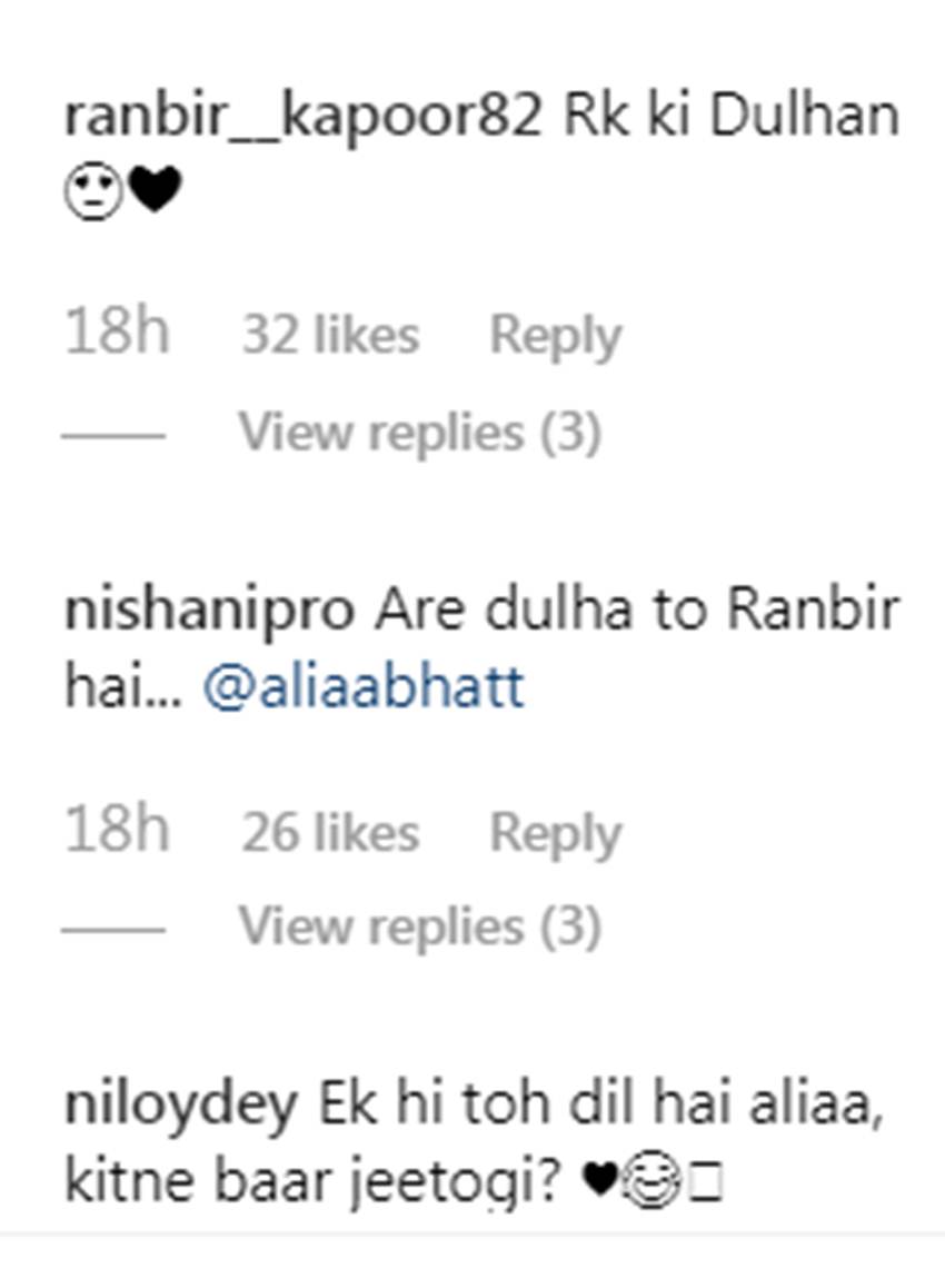 एक सोशल मीडिया यूजर ने लिखा- विवाह करोगी हमसे? वहीं एक अन्य यूजर लिखता है- रूको, आ रहा हूं बस दो मिनट में। शेरवानी थोड़ी टाइट है। एक इंस्टाग्राम यूजर ने लिखा- आरके की दुल्हन। वहीं एक इंस्टा हैंडल लिखता है- अरे दूल्हा तो रणबीर है। वहीं एक यूजर ने लिखा- एक ही तो दिल है आलिया, कितनी बार जीतोगी?