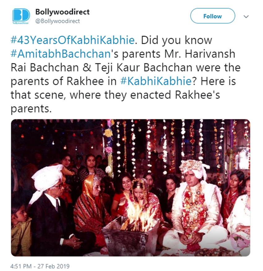 तस्वीर में बिग बी के माता-पिता उनकी एक फिल्म के लिए एक्टिंग करते नजर आ रहे हैं। फिल्म ‘कभी-कभी’ साल 1976 में आई थी। इस फिल्म में अमिताभ बच्चन के माता-पिता तेजी कौर बच्चन और हरिवंश राय बच्चन एक्ट्रेस राखी के माता-पिता की भूमिका में नजर आते हैं। इस सीन में एक्ट्रेस राखी और शशि कपूर शादी के एक सीन में नजर आते हैं। फिल्म ‘कभी-कभी’ साल 1976 में रिलीज हुई थी। फिल्म में अमिताभ बच्चन, शशि कपूर, ऋषि कपूर, वहीदा रहमान, नीतू कपूर, सिमी ग्रेवाल और राखी मेन लीड रोल थे। यह रोमांटिक फिल्म यश चोपड़ा ने डायरेक्ट की थी। इस फिल्म से गाना ‘कभी-कभी मेरे दिल में, खयाल आता है…।’ उस वक्त का सबसे पॉपुलर रोमंटिक सॉन्ग बन गया था। आज भी यह गाना फैन्स में काफी लोकप्रिय है।