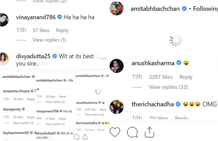इसके अलावा स्टार्स और सेलेब्स भी अमिताभ बच्चन के इस पोस्ट पर रिएक्ट करते दिखे। अनुष्का शर्मा ने अमिताभ बच्चन के पोस्ट पर कमेंट करते हुए लाफिंग इमोजी के साथ रिएक्ट किया। तो वहीं डायना पेंटी ने भी ढेर सारे लाफिंग इमोजीस की बरसात कर दी। इसके अलावा दिव्या दत्ता ने लिखा- ‘आपकी बुद्धि गजब है।’ अमिताभ बच्चन इस तरह के ह्यूमर पोस्ट फैंस के साथ सोशल मीडिया पर शेयर करते ही रहते हैं।