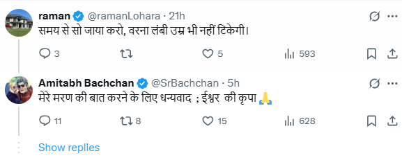 बिग बी के इसी पोस्ट पर एक और शख्स ने भी कुछ ऐसा ही कमेंट किया, जिसमें यूजर ने लिखा, “समय से सो जाया करो, वरना लंबी उम्र भी नहीं टिकेगी।” इस शख्स को भी बिग बी ने जवाब दिया। एक्टर ने लिखा, “मेरे मरण की बात करने के लिए धन्यवाद, ईश्वर की कृपा।”