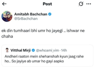 दरअसल, अमिताभ बच्चन ने अपने सोशल मीडिया हैंडल एक्स पर एक ट्वीट किया, जिसमें उन्होंने लिखा, “Gadgets break .. Longevity lasts”। उनके इस पोस्ट पर कई लोगों ने कमेंट सेक्शन में अपना रिएक्शन दिया। वहीं, विट्ठल नाम के एक यूजर ने बिग बी को ट्रोल करने की कोशिश की और लिखा, “अंधेरी रातों में शहंशाह क्यों जाग रहे हो… सो जाइये अब उम्र हो गई आपकी।”