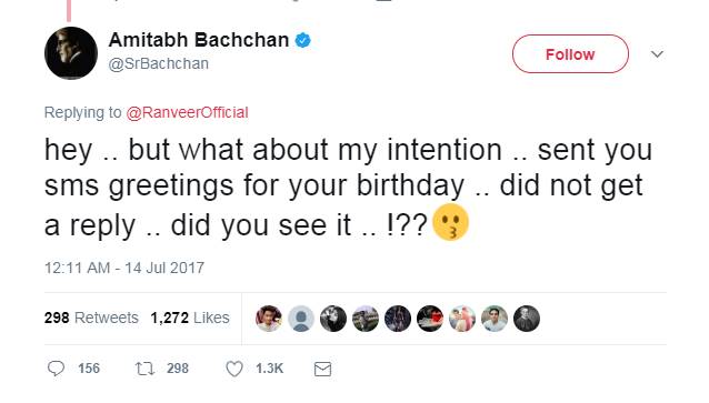 इसके बाद बॉलीवुड के एंग्री यंग मैन ने रणवीर को जवाब देने के लिए एक और ट्वीट किया और इसमें उन्होंने लिखा- हे… लेकिन मेरे बारे में क्या ख्याल है… जन्मदिन पर मैंने एसएमएस करके शुभकामनाएं भेजी थीं… कोई जवाब ही नहीं मिला… क्या आपने उसे देखा? अमिताभ के इस मैसेज के जवाब में रणवीर ने लिखा- उस मैसेज के सिवा मैंने हर एक का जवाब दिया है। मैंने अभी इसे क्रॉस चेक भी किया। आप शुभकामना देने वाले सबसे पहले लोगों में भी शामिल हैं। दूसरे ट्वीट में रणवीर ने उनका आभार व्यक्त करते हुए लिखा कि यही छोटी-छोटी बातें आपको महान बनाती हैं।