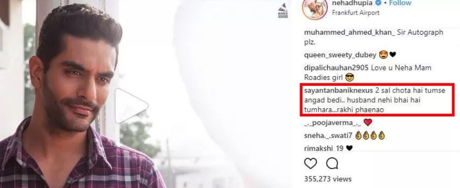 बॉलीवुड अभिनेत्री नेहा धूपिया और अंगद बेदी ने 10 मई को शादी का ऐलान कर अपने फैंस को चौंका दिया था। उसके बाद नए-नवेले जोड़े की शादी की तस्वीरें सोशल मीडिया पर खूब शेयर की गईं। हालांकि इसके अलावा भी नेहा और अंगद बेदी बी-टाउन में चर्चा का विषय बने हुए हैं। हाल ही में सोशल मीडिया पर ट्रोर्ल्स ने नेहा धूपिया को अपने से दो साल छोटे अंगद बेदी के साथ सात फेरे लेने के लिए ट्रोल किया था। नेहा और अंगद की ब्रांदा के नाइट ऑउट तस्वीरों पर भद्दे-भद्दे कमेंट्स करने वालों को अब खुद अंगद बेदी ने मुंहतोड़ जवाब दिया है।