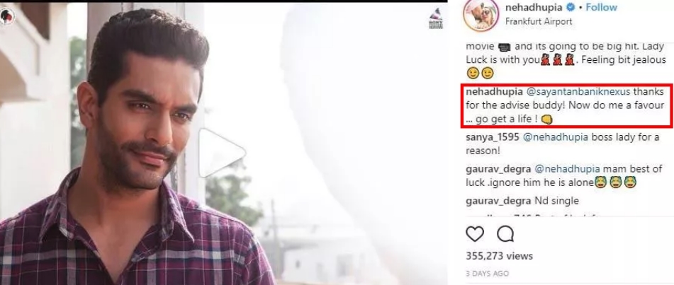 अंगद ने एक इंस्टाग्राम हैंडल को जवाब देते हुए लिखा, आपकी मां ने यही शिक्षा दी है? तुम धरती मां के लिए वेस्ट हो। क्योंकि तुम्हारे जैसों को बहुत लोग पसंद करते हैं, इसलिए हमारे देश का नाम बर्बाद होता है। कुछ दिनों पहले नेहा इंस्टाग्राम अकाउंट पर ट्रोल हुई थीं। 37 साल की नेहा धूपिया 35 साल के अंगद बेदी के साथ शादी के बंधन में बंधी हैं, दोनों पिछले काफी समय से एक दूसरे को डेट कर रहे थे। ट्रोर्ल्स के निशाने पर नेहा धूपिया उस वक्त आ गईं जब नेहा ने अंगद को उनकी अपकमिंग फिल्म सूरमा के लिए बधाई दी। इसके बाद नेहा के फॉलोवर्स पोस्ट पर दोनों की उम्र में अंतर बताने लगे। एक यूजर ने कमेंट बॉक्स पर लिखा, दो साल छोटा है तुमसे अंगद बेदी, पति नहीं भाई है तुम्हारा। राखी पहनाओ। इसके बाद नेहा ने कमेंट का रिप्लाई देते हुए लिखा, सलाह के शुक्रिया भाई, अब एक फेवर कर दो कि जाकर अपनी जिंदगी जिओ।