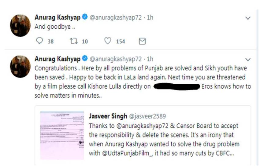 अनुराग कश्यप ने ट्विटर पर अपनी भड़ास निकालते हुए कहा है कि आपत्तिजनक दृश्यों को बिना उनकी इजाजत के फिल्म से हटा दिया गया है। अब पंजाब की सारी समस्याएं खत्म हो गईं हैं। अनुराग कश्यप ने लिखा कि ‘मुबारक। अब यहां से पंजाब की सभी समस्याएं खत्म हो गईं। युवा सिख अब सुरक्षित हैं। La La land पर दोबारा आकर खुश हो जाइए।’ अपने ट्वीट में अनुराग कश्यप ने Eros के अध्यक्ष किशोर लूला का निजी मोबाइल नंबर डालते हुए लिखा कि ‘Eros को मालूम है कि कैसे मिनटों में ऐसे मामलों को सुलझाते हैं। आगे से किसी फिल्म को लेकर धमकी मिले तो सीधे Eros से संपर्क करें।’