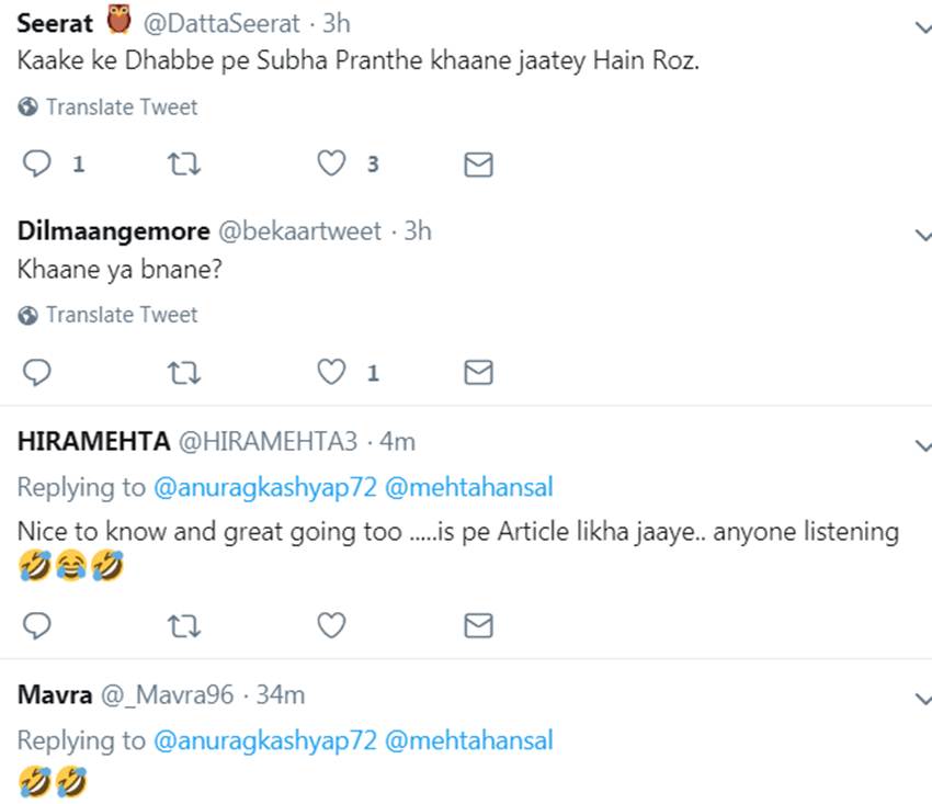 अनुराग कश्यप के इस ट्वीट के जवाब में कई सारे सोशल मीडिया यूजर्स ने भी रिएक्शन दिया है। एक यूजर ने लिखा- सर आपका खून कब खौलेगा, आपकी अगली फिल्म कब आ रही है। वहीं एक अन्य यूजर ने लिखा- रात को क्यों, अब ये काम भी शुरू कर दिया। वहीं कई यूजर्स ने हंसल मेहता की चुटकी लेते हुए लिखा है कि वह खाना खाने जाते हैं या फिर बनाने? इसके अलावा भी कई यूजर्स ने फनी रिएक्शन्स दिए हैं।