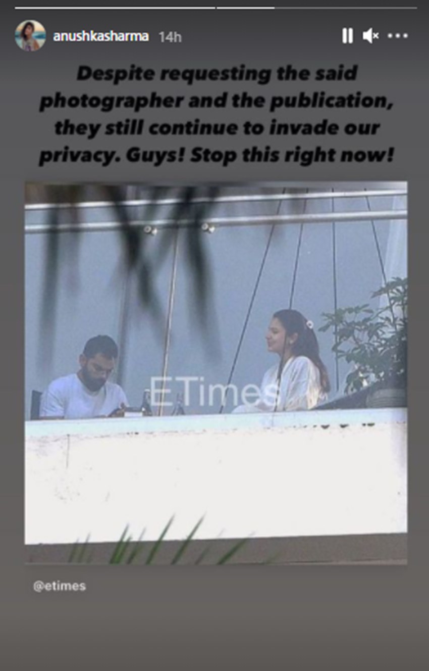 अनुष्का शर्मा अपने घर की बालकोनी में बैठी थीं वहीं उनके साथ उनके हसबेंड और क्रिकेटर विराट कोहली भी चिल कर रहे थे। सोशल मीडिया पर व्हाइट ड्रेस पहने अनुष्का की बालकोनी वाली तस्वीर सामने आई, जिसे अनुष्का ने अपने इंस्टाग्राम स्टोरी से पोस्ट किया और फोटोग्राफर्स को हिदायत दी। एक्ट्रेस ने भड़कते हुए मीडिया के लिए कहा कि-रिक्वेस्ट करने के बावजूद भी फोटोग्राफर्स और पब्लिकेशन्स तस्वीरें खींच रहे हैं और हमारी प्राइवेसी खराब कर रहे हैं। गाइज स्टॉप दिस राइट नाऊ, इसे अभी के अभी बंद करो।’