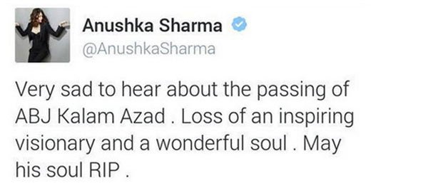 अनुष्का ने डॉ. कलाम को श्रद्धांजलि देते हुए अपने ट्वीट में APJ Abdul Kalam के बदले ‘ABJ Kalam Azad’ लिख दिया था।