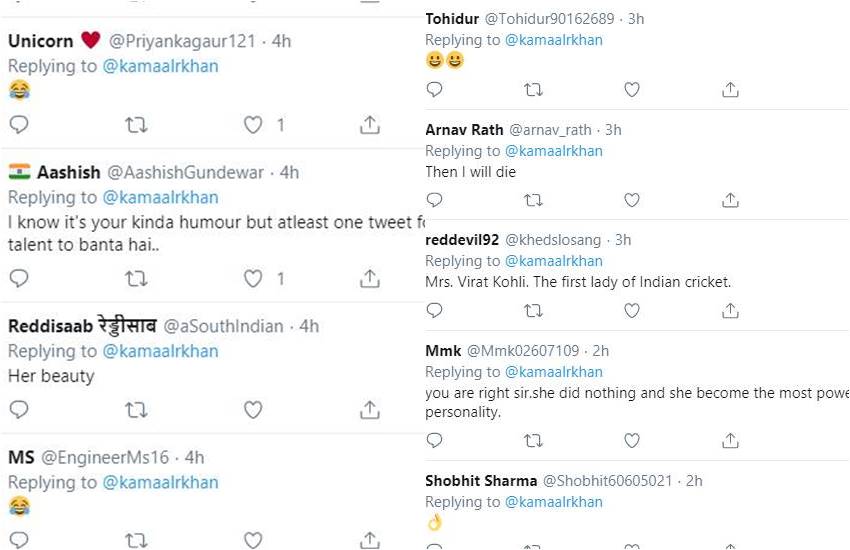 एक यूजर ने केआरके के इस ट्वीट को देख कर जवाब में कहा- ‘आप जरा एक बार आईना देखें, आपके सारे डाउट क्लियर हो जाएंगे।’ तो किसी ने कहा- अपने कैप्टन साब की बीवी है सर, कैसे पावरफुल नहीं होगी। तो कोई अनुष्का की ही टांग खिंचाई करता कहता- ‘अच्छी एक्ट्रेस है, सेलेक्टर ऑफ इंडियन क्रिकेट टीम। और क्या चाहिए।’  देखें और क्या क्या कह रहे ट्विटर यूजर्स:-