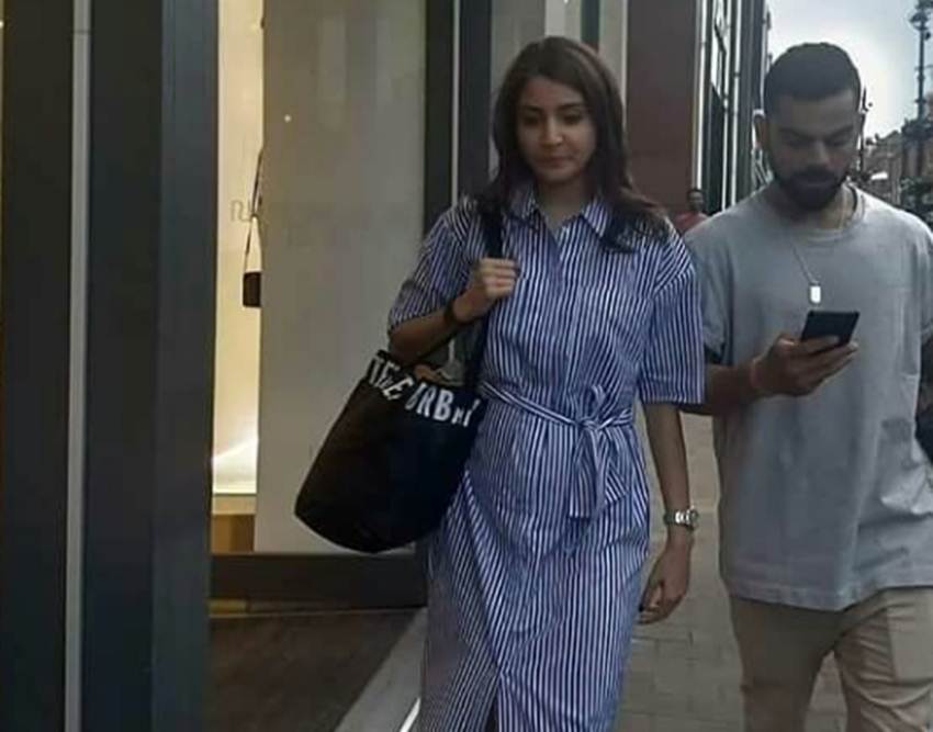 विराट कोहली और अनुष्का शर्मा का नाम बॉलीवुड के चहेते कपल्स की लिस्ट में शुमार है। बिजी शेड्यूल के बावजूद विराट-अनुष्का एक-दूसरे के समय निकाल ही लेते हैं। इसी बीच सोशल मीडिया पर कपल की एक तस्वीर वायरल हो रही है जिसमें वह एक दूसरे के साथ क्वालिटी टाइम स्पेंड करते हुए नजर आ रहे हैं। इंटरनेट पर वायरल हो रही तस्वीर में ब्लू कलर की ड्रेस में अनुष्का शर्मा आगे-आगे चलती हुई नजर आ रही हैं तो वहीं पति विराट कोहली उनके पीछे-पीछे चलते हुए दिख रहे हैं। तस्वीर में क्रिकेटर अपने फोन में बिजी नजर आ रहे हैं। फैन्स अनुष्का और विराट के एक वीडियो को भी सोशल मीडिया पर शेयर कर रहे हैं। वीडियो में कपल शॉपिंग करते हुए नजर आ रहे हैं।