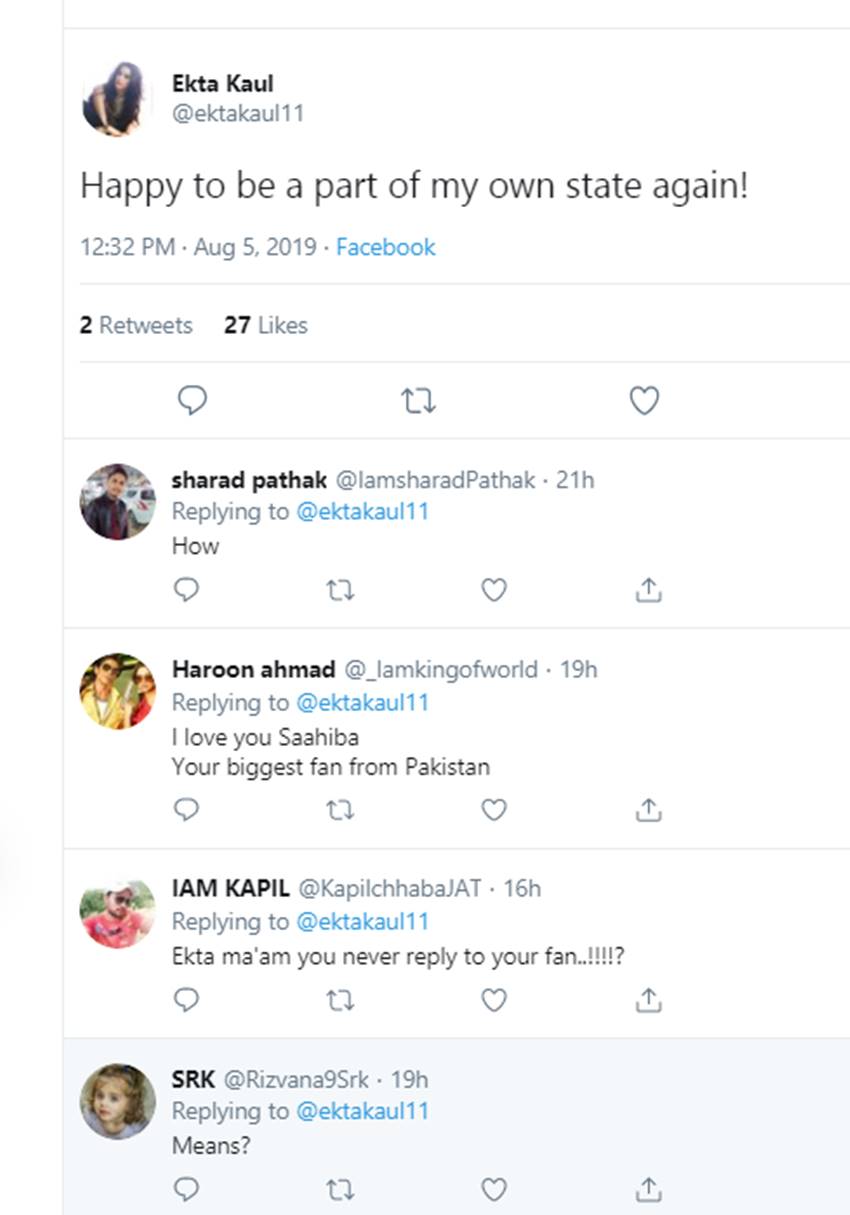 ARTICLE 370: टीवी एक्ट्रेस एकता कौल मोदी सरकार के ‘आर्टिकल 370’ हटाए जाने के फैसले से बेहद खुश हैं। वजह है कि वह शादी के बाद एक बार फिर से कश्मीर को अपना स्टेट कह पाएंगी। टीवी शो ‘मेरे अंगने में’ से दर्शकों के बीच प्रसिद्धी पाने वालीं एक्ट्रेस ने पिछले साल 15 सितंबर 2018 को टीवी एक्टर सुमित व्यास से शादी रचाई थी। इस खबर को सुनने के बाद कश्मीर की एकता कौल अपनी खुशी जाहिर करते हुए कहती हैं कि ये मेरे लिए सबसे बड़ी खुशी की बात है। बता दें, सुमित व्यास से शादी के बाद एकता कश्मीरी से नॉन कश्मीरी हो गई थीं।
