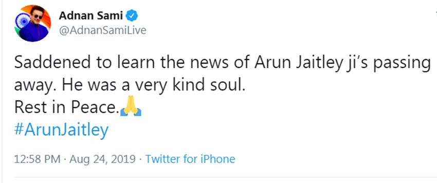 सिंगर अदनानी सामी ने अरुण जेटली को श्रद्धाजंलि अर्पित करते हुए ट्विटर पर लिखा- ‘अरुण जेटली जी के गुजरने की खबर को सुनकर दुख हुआ। वह एक अच्छे इंसान थे। उनकी आत्मा को शांति मिले।’ वहीं बॉलीवुड अभिनेता सनी देओल ने लिखा- ‘देश एक अन्य महान नेता खो दिया। हमारी संवेदनाएं उनके परिवार के साथ हैं।’