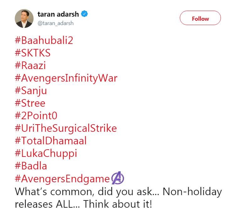 तरण आदर्श ने एक ट्वीट में सभी नॉन हॉली-डे फिल्मों की लिस्ट जारी की है। इन फिल्मों ने छुट्टी न होने के बावजूद भी बॉक्स ऑफिस पर धमाकेदार कमाई की।