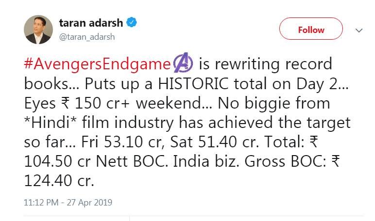 अवेंजर्स एंडगेम ने शनिवार को 51 करोड़ 40 लाख रुपए की कमाई की है। इस हिसाब से फिल्म का कुल कलेक्शन 104 करोड़ 50 लाख रुपए हो गया है। जबकि फिल्म का ग्रॉस 124 करोड़ 40 लाख रुपए हो गया है।