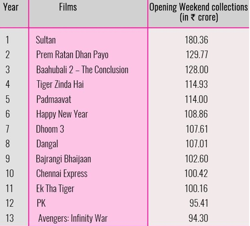 मीडिया रिपोर्ट्स के अनुसार, शाहरुख खान की फिल्म ‘रईस’ ने ओपनिंग वीकेंड पर 93 लाख 24 करोड़ रुपए की कमाई की थी, वहीं ऋतिक रोशन की फिल्म ‘बैंग बैंग’ ने ओपनिंग वीकेंड पर 94 करोड़ 13 लाख रुपए का बिजनेस किया था। जबकि ‘अवेंजर्स- इनफिनिटी वॉर’ ने अपने ओपनिंग वीकेंड पर 94 करोड़ 3 लाख रुपए की कमाई महज तीन दिनों में ही कर ली है। फिल्म की कमाई की रफ्तार अभी भी थमी नहीं है। कहा जा रहा है कि फिल्म ‘अवेंजर्स- इनफिनिटी वॉर’ को दर्शकों की ओर से मिल रहे पॉजिटिव रिस्पांस के कारण कई अन्य फिल्मों को भी कमाई के मामले में मात दे सकती है।