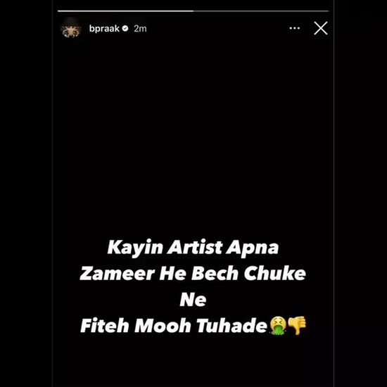 दिलजीत दोसांझ और हानिया आमिर की ‘सरदार जी 3’ के विवादों के बीच सिंगर बी प्राक ने इंस्टाग्राम स्टेटस पर एक पोस्ट शेयर की है। इस पोस्ट में उन्होंने किसी के नाम का जिक्र नहीं किया है। इसे शेयर करने के साथ ही उन्होंने लिखा, ‘कई आर्टिस्ट अपना जमीर ही बेच चुके ने, फिट्टे मुंह तोड्डे (शर्म आनी चाहिए)।’ अब बी प्राक की ये पोस्ट वायरल हो रही है। हालांकि, उन्होंने इसमें किसी का नाम नहीं लिखा है लेकिन, इसे दिलजीत दोसांझ से जोड़ा जा है। सोशल मीडिया यूजर्स का मानना है कि ये पोस्ट दिलजीत पर सीधा हमला है।