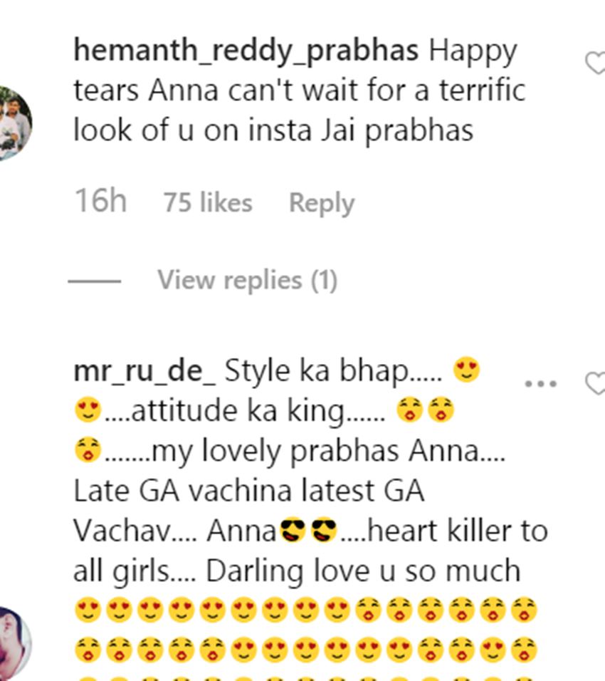 ऐसे में फैन्स अपने फेवरेट स्टार की तस्वीर पर गजब के कमेंट कर रहे हैं। एक फैन ने प्रभास की खूब तारीफ करते हुए लिखा-स्टाइल का बाप, ऐटीट्यूड का किंग.. माय लवली प्रभास अन्ना।’ तो दूसरे फैन ने लिखा- ‘खुशी के आंसू रोक नहीं पा रहा। बस अब फोटो पर ट्रैफिक का इंतजार है। अन्ना।’