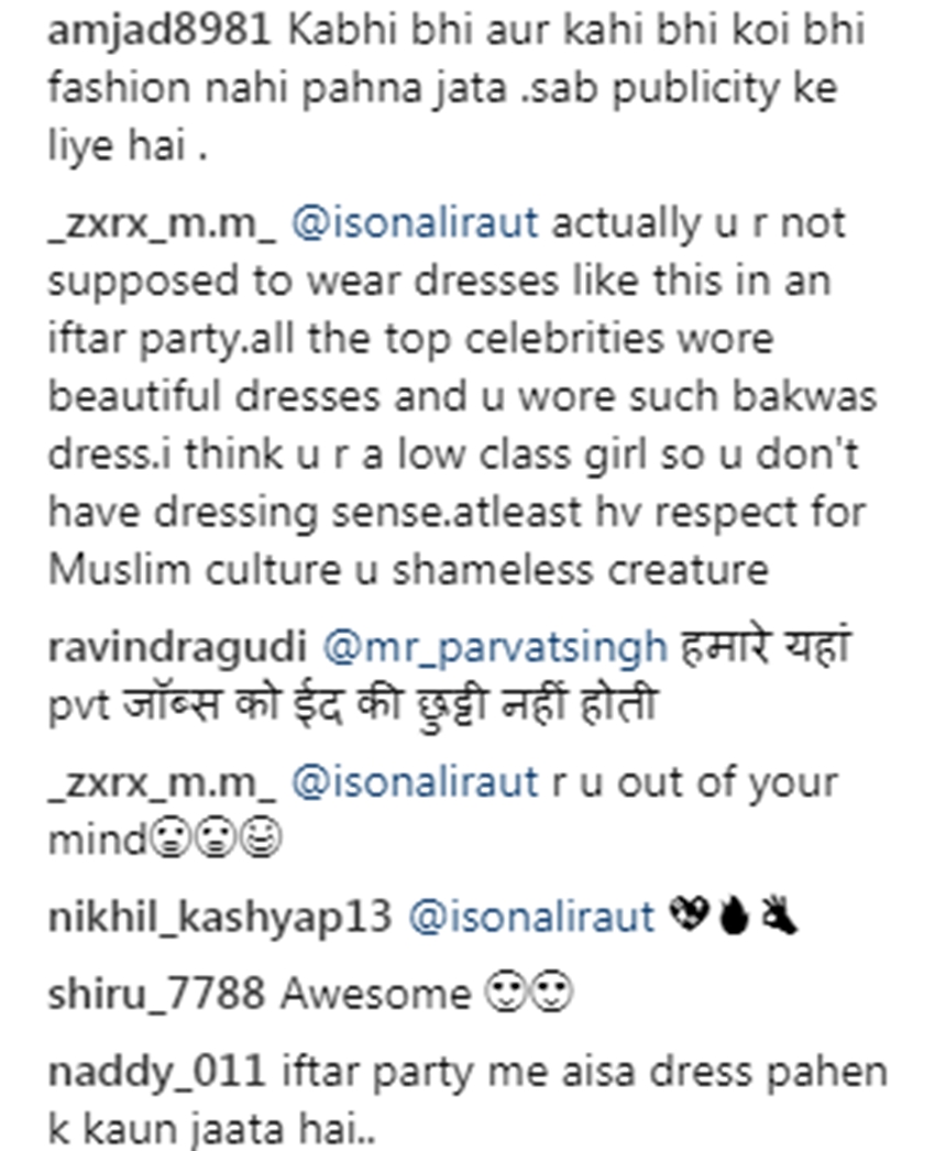 वहीं एक अन्य यूजर लिखता है, पता नही ये कहाँ का फैशन हो गया जिसे चाहा इफ्तार में बुला लिया। इफ्तार सिर्फ और सिर्फ रोज़ेदार के लिये होता है। और ये मोहतरमा तो पूरे दिन खा पी के गयी होगी और भी ऐसे कपड़े पहन के कम से कम अगर गयी हो तो कुछ ढंग का पहन लेती थोड़ी देर के लिए उससे तुम्हारी पब्लिसिटी कम नही होजाती। शर्म करो शर्म। बेरोजगारी की इफ्तार पार्टी वाह भाई वाह। सोनाली राउत की तस्वीरों पर ज्यादातर हेट कमेंट्स ही आए हैं। सोनाली की तस्वीरों को 39 हजार से ज्यादा लाइक्स मिल चुके हैं। सोनाली के इंस्टाग्राम पर 4 लाख से ज्यादा फॉलोवर्स हैं।