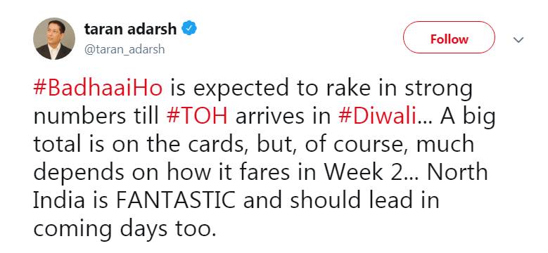 तरण ने एक अन्य ट्वीट में लिखा- ‘बधाई हो’ से उम्मीद जताई जा रही है कि फिल्म दीवाली आने तक बॉक्स ऑफिस पर अच्छा कलेकशन करने में सफल होगी। बेशक फिल्म की कमाई दूसरे वीक पर भी निर्भर करती है। नार्थ इंडिया में फिल्म ने शानदार प्रदर्शन किया और आने वाले दिनों में लीड कर सकती है।